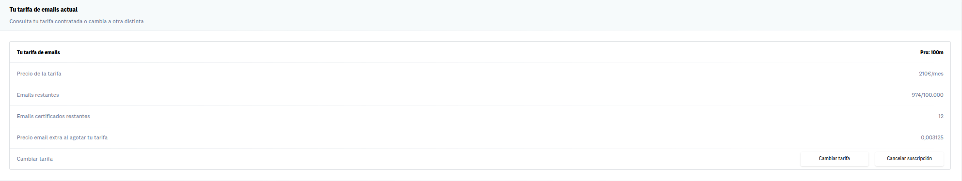 Si tu tarifa incluye créditos de email certificado, puedes consultar los créditos restantes en la sección Mi Tarifa de las preferencias de cuenta.