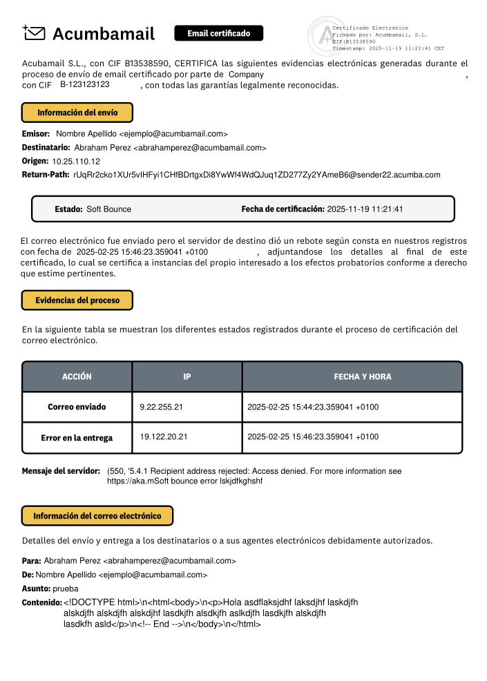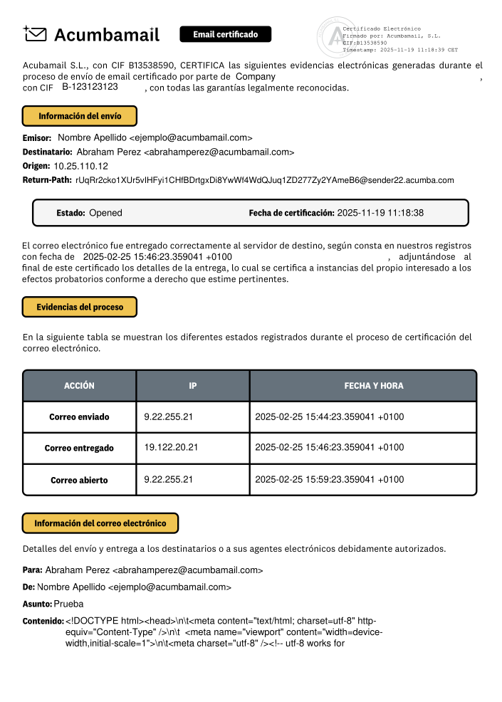 En el caso de un envío sin errores, el certificado mostrará, además de los detalles del envío, la IP desde la que se ha realizado el envío, la del servidor que recibe el email, y la de apertura (en caso de que esta se haya producido), así como las horas de cada evento.