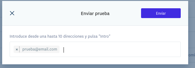 Una vez completos los campos del formulario, podrás realizar una prueba o generar el envío certificado. Si optas por enviar una prueba, pulsa el botón "Enviar una prueba" y añade el email o emails a los que quieres enviarla.